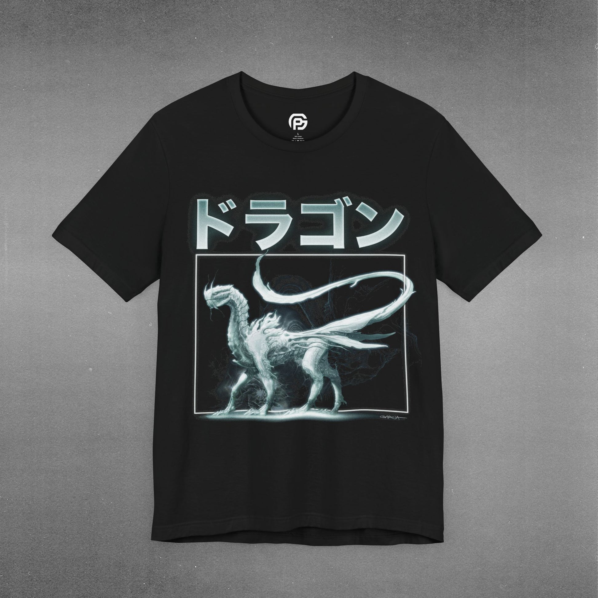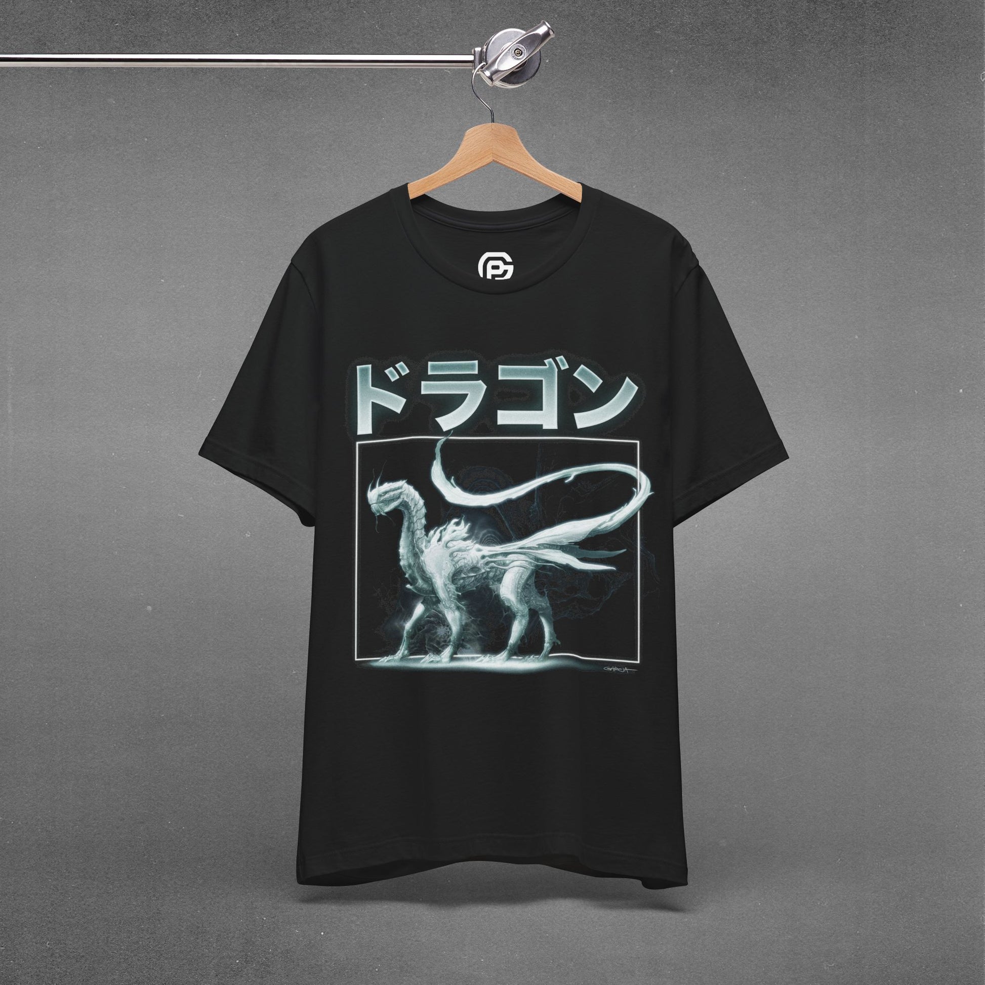 The Japanese katakana above the art reads “ドラゴン” (Dragon)—because this isn’t just a dragon, it’s a creature from an unseen dimension. Elegant, ethereal, and etched in fine detail, this sleek ice/white-on-black design makes a bold statement whether you’re out in the city or deep in your creative zone.